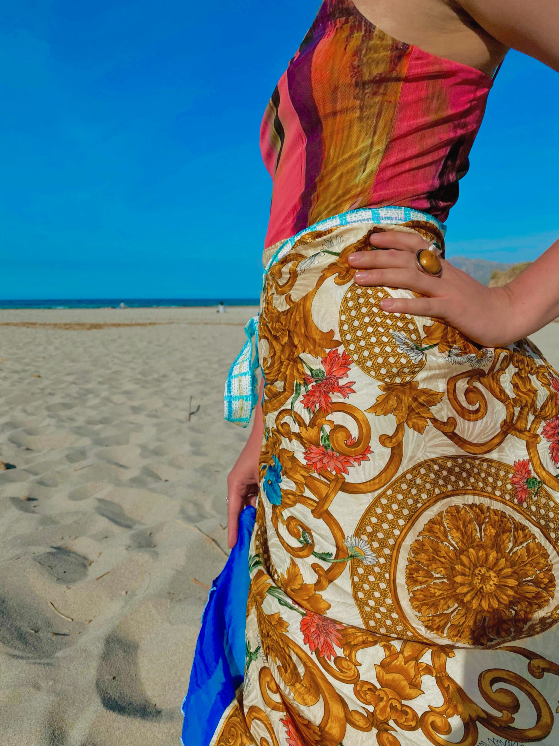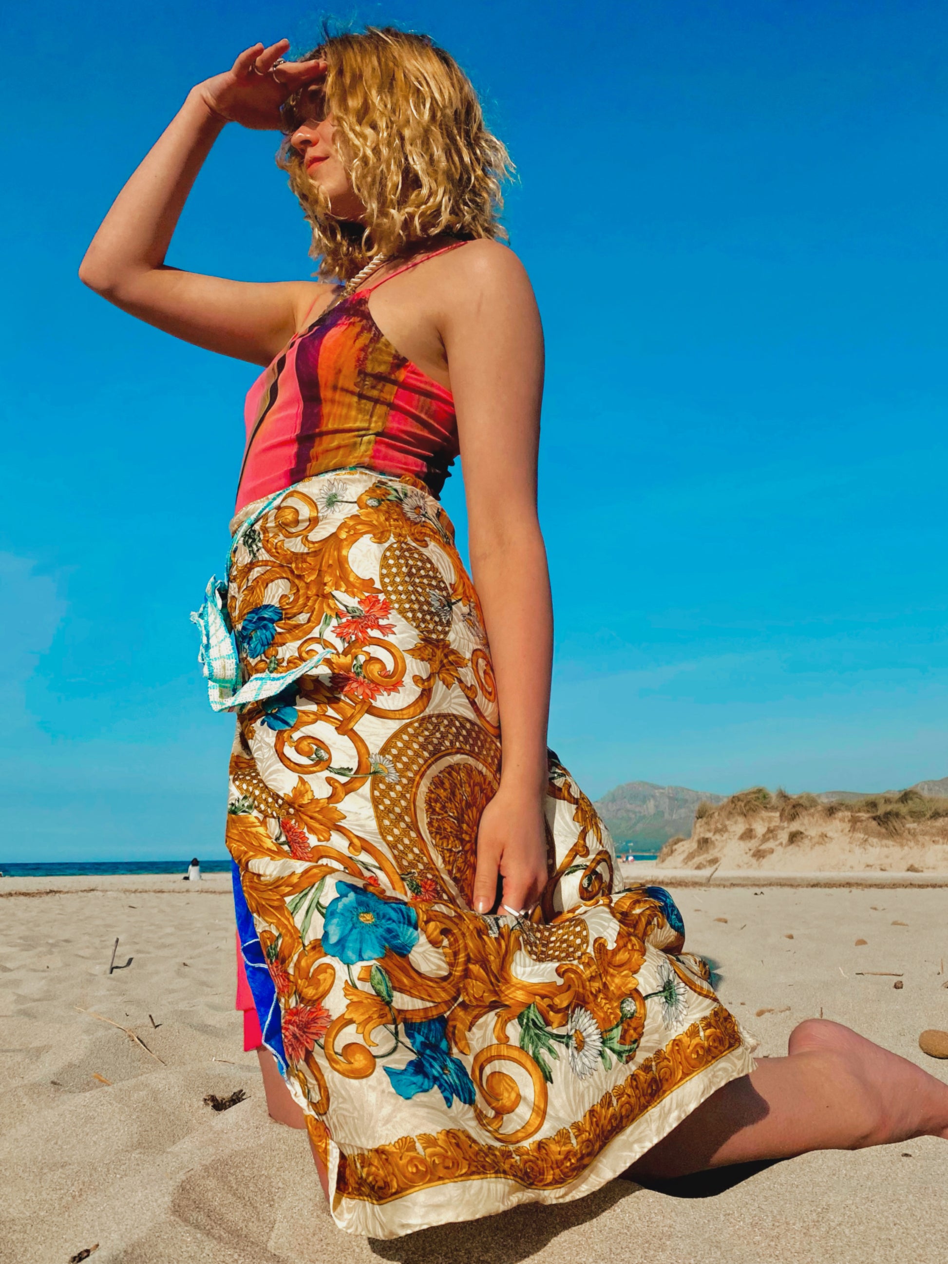Der Wickelrock aus 100% Seide überzeugt mit seinen sättigen Farben und floral-orientalischen Mustern. Einfach zum Binden um die Taille oder Hüfte, lässt er den Spielraum für Kombinationen. Der eingearbeitete blaue Seidenstoff
